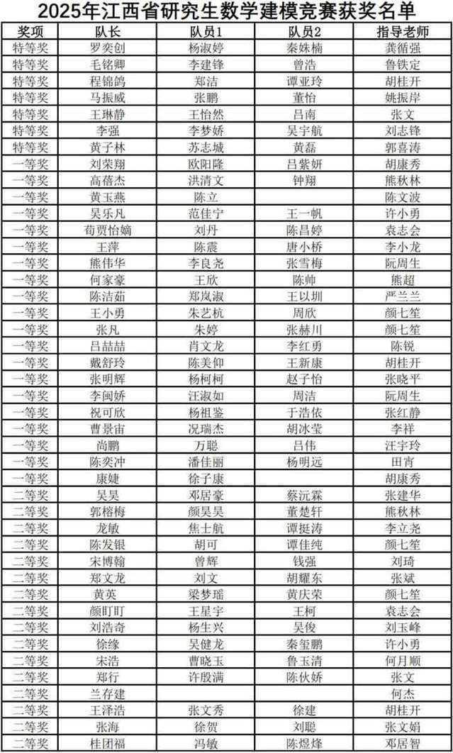 7月7日,2025年江西省研究生数学建模竞赛获奖名单正式揭晓。爱体育官方网站研究生代表队表现优异,共斩获特等奖7项、一等奖20项、二等奖16项,学校荣获优秀组织奖,创下我校在此项赛事中的历史最佳成绩。