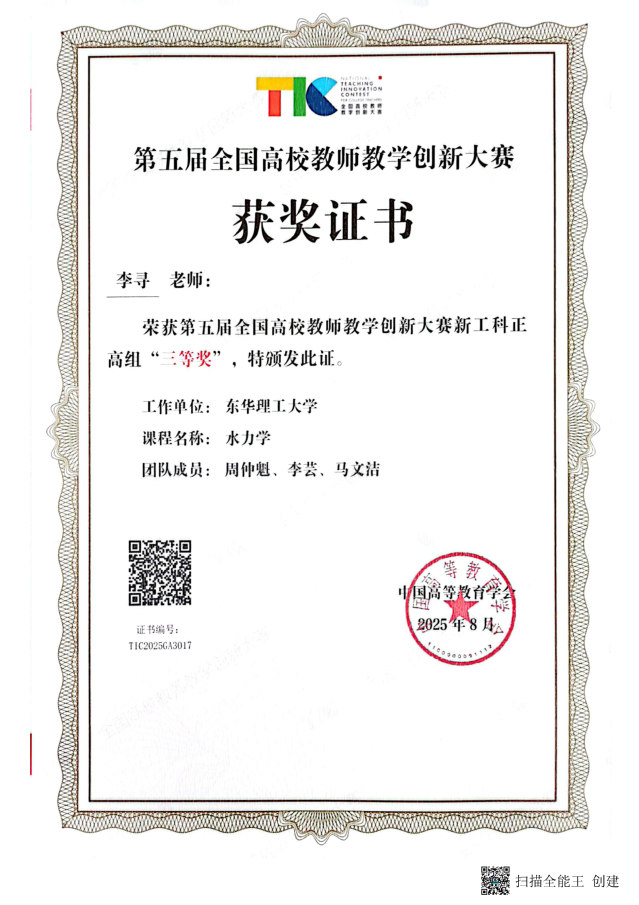 8月16日至19日,由教育部高等教育司指导、中国高等教育学会主办的第五届全国高校教师教学创新大赛在北京理工大学举行。爱体育官方网站水资源与环境工程学院李寻教师(团队)获新工科正高组三等奖。