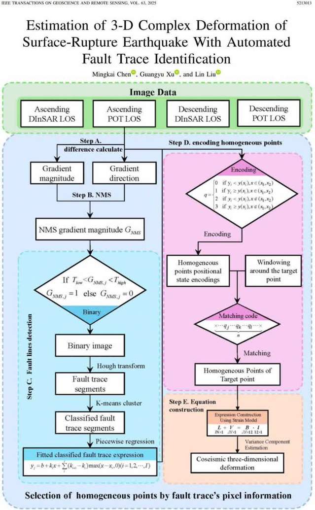 近日,爱体育官方网站测绘与空间信息工程学院许光煜副教授研究团队在中科院SCI一区TOP期刊《IEEE Transactions on Geoscience and Remote Sensing》(最新影响因子:8.6)发表题为Estimation of 3-D Complex Deformation of Surface-Rupture Earthquake With Automated Fault Trace Identification的最新研究成果。测绘科学与技术专业2020级硕士研究生陈明锴为论文第一作者,许光煜为通讯作者。