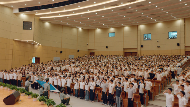 校领导为新生代表佩戴校徽,全体新生向师长行拜师礼并宣誓。
