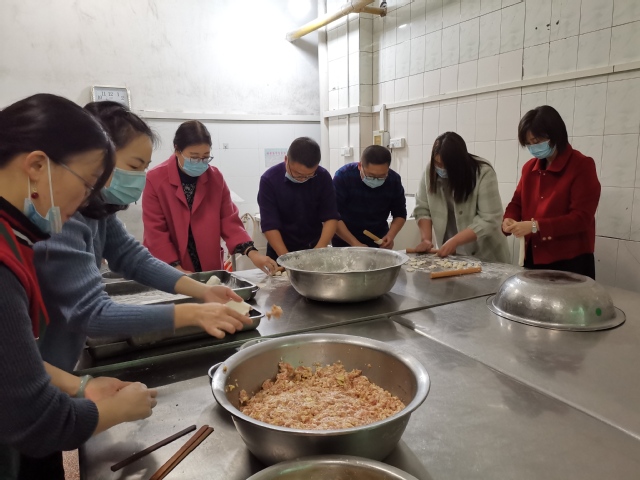 2月9日,学校在北区食堂一楼为因疫情留校过年的教职工举办集体年夜饭活动。校长孙占学,党委组织部、人事处、后勤保障处等相关部门负责人和留校教职工欢聚一堂,擀面皮、包饺子、吃年饭、叙家常,其乐融融。