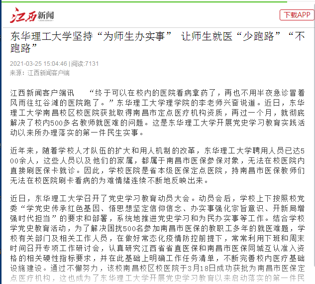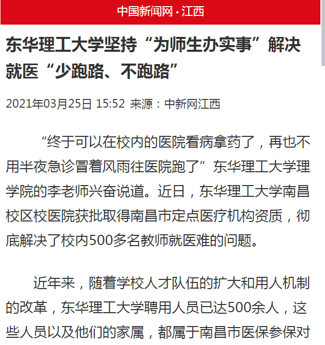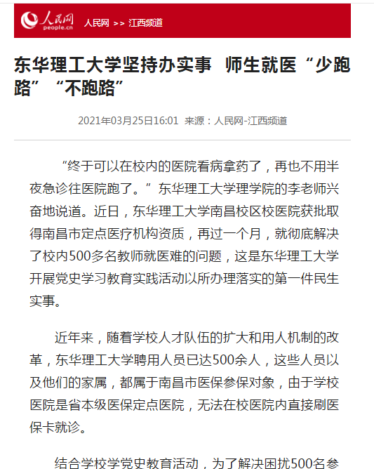 编者按:近日,我校南昌校区校医院成功获批为南昌市医保定点医疗机构,就此解决了我校近500名持南昌市医保教师及其家属无法在校医院刷卡看病的难题。这也成为了我校开展党史学习教育以来启动落实的第一件民生实事。人民网、中新网、江西新闻客户端等媒体对此进行报道,现将相关内容转载如下: