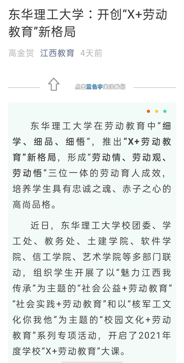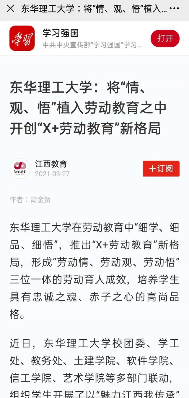 编者按:为深入贯彻落实《中共中央国务院关于全面加强新时代大中小学劳动教育的意见》要求,落实立德树人根本任务,培养德智体美劳全面发展的社会主义建设者和接班人,我校在劳动教育中“细学、细品、细悟”,推出“X+劳动教育”新格局,形成“劳动情、劳动观、劳动悟”三位一体的劳动育人成效,培养学生具有忠诚之魂、赤子之心的高尚品格。新华社客户端、学习强国、江西日报、江西教育、新浪网等媒体对此进行报道,现将相关内容转载如下: