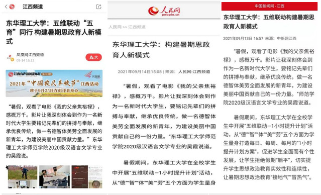 编者按:暑假期间,我校开展“五维联动—1小时提升计划”活动,从“德”“智”“体”“美”“劳”五方面为学生量身打造每日、每周、每月的“1小时提升计划方案”,促进学生全面发展,引导学生拒绝假期“躺平”,切实提升学生思想政治教育实效性和连续性,让暑期思想政治教育“接地气”“冒热气”。人民网、中新网、新华社、江西新闻客户端、江西教育网、凤凰网等对此进行报道,现将相关内容转载如下:
