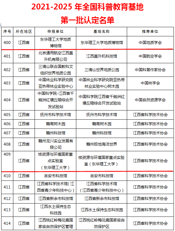 2月7日,中国科协办公厅公示“2021-2025年全国科普教育基地第一批认定名单”,爱体育官方网站地质博物馆、核资源与环境国家重点实验室(爱体育官方网站)成功入选。