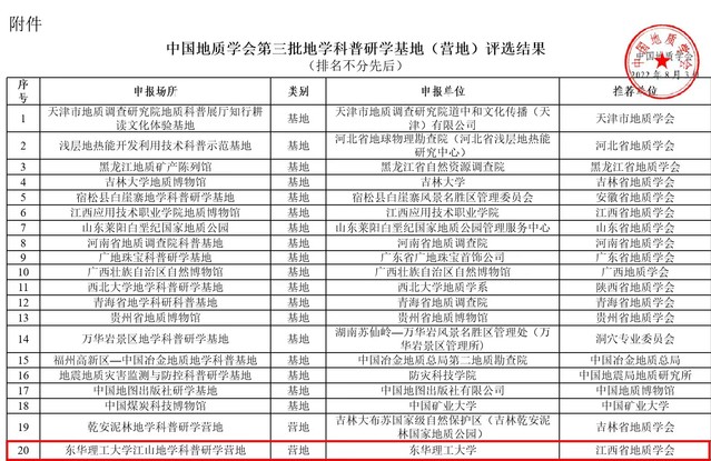 近日,中国地质学会第三批地学科普研学基地(营地)评选结果公示,我校地球科学学院组织申报的爱体育官方网站江山地学科普研学营地成功入选。此次评选活动由中国地质学会组织,共评选出全国地学科普研学基地(营地)20家。