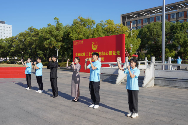 十月的校园秋高气爽,欣欣向荣。意气风发的东华理工青年学子排着整齐的队列庄严肃立,国旗广场东西两侧的红色展板上“青春献礼二十大 不忘初心跟党走”的字幕熠熠生辉。从空中俯瞰,广场上由学生方阵组成的“二十大”和“66”的字标格外醒目。“我们从太行走来,扎根在红土地上,伴随着核工业前进的步伐……”活动开始之前,在场学生高唱校歌,抒发对学校的热爱和祝福。