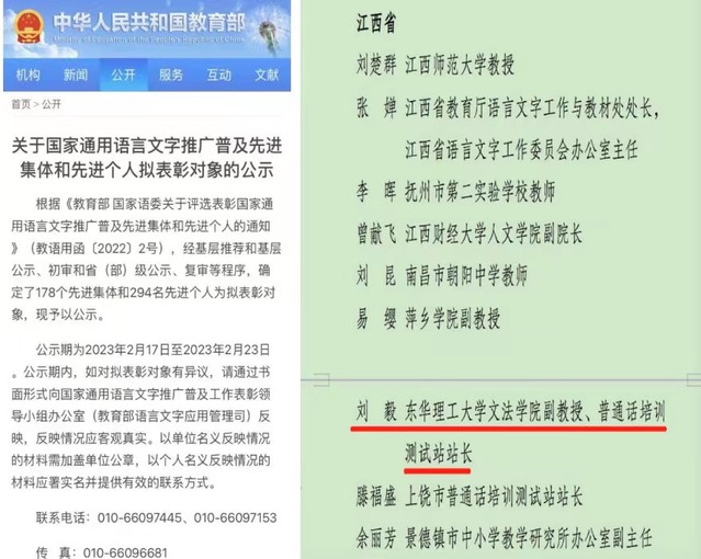 近日,教育部公布了《教育部国家语委关于评选表彰国家通用语言文字推广普及先进集体和先进个人的通知》,我校普通话测试站站长、文法学院刘毅副教授荣获“国家通用语言文字推广普及先进个人”。该奖项经国务院批准,由教育部、国家语委发布,全国共294人获表彰,江西省9人。