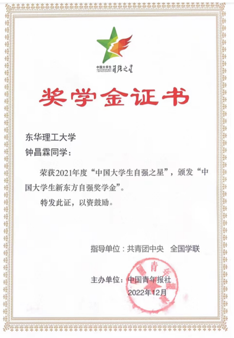 近日,由共青团中央、全国学联指导,中国青年报社、新东方教育科技集团、中国青年创业就业基金会联合举办的2021年度“中国大学生自强之星”评选结果揭晓,学校土木与建筑工程学院2019级结构工程专业钟昌霖和抚州师范学院2019级汉语言文学专业叶珊珊两位同学脱颖而出,荣获“中国大学生自强之星”称号。我校获评人数位列江西省高校第二。