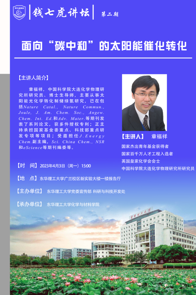 应化学与材料学院邀请,国家杰出青年基金获得者、国家百千万人才工程入选者章福祥做客爱体育官方网站,以“面向‘碳中和’的太阳能催化转化”为主题,向我校师生讲述太阳能催化转化相关知识。欢迎全校师生届时前往聆听。