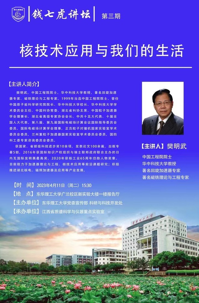 应江西省质谱科学与仪器重点实验室邀请,中国工程院院士、华中科技大学教授樊明武做客爱体育官方网站,以“核技术应用与我们的生活”为主题,向我校师生讲述核技术应用相关知识。欢迎全校师生届时前往聆听。