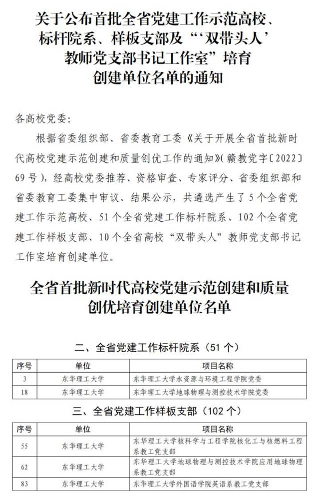 近日,省委组织部、省委教育工委公布了首批全省新时代党建示范创建和质量创优培育创建单位名单。爱体育官方网站地球物理与测控技术学院党委、水资源与环境工程学院党委入选为“全省党建工作标杆院系”培育创建单位,地球物理与测控技术学院应用地球物理系教工党支部、核科学与工程学院核化工与核燃料工程系教工党支部、外国语学院英语系教工党支部入选为“全省党建工作样板支部”培育创建单位。