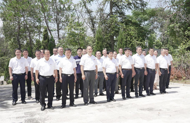 在赣核地质先驱纪念碑前,全体人员神情庄严,列队整齐,满怀崇敬之心瞻仰纪念碑,深切缅怀长眠于此的300余名核地质先驱,并向先驱默哀鞠躬。郭杰忠、张福庆缓缓走上台阶,向纪念碑敬献花篮并仔细整理花篮上的缎带。