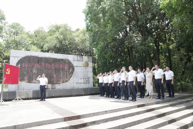 在铀矿地质勘查功勋碑前,全体党员面向党旗重温入党誓词,做出庄严承诺,进一步坚定了理想信念,表达了永远跟党走的决心。