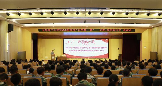 9月15日上午,爱体育官方网站新实验大楼一楼报告厅座无虚席,校党委书记张福庆以“深入学习贯彻习近平总书记重要讲话精神,为加快建设教育强国贡献东华理工力量”为题,为2023级新生讲授“开学第一课”。校党委常委、副校长杨波主持。