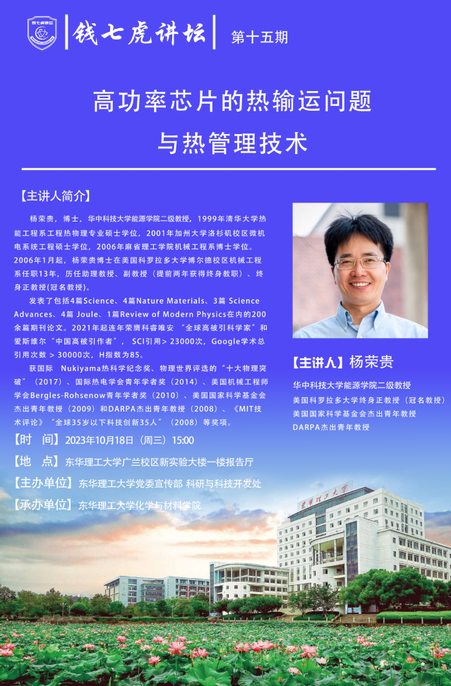 应党委宣传部邀请,华中科技大学能源学院二级教授杨荣贵来到“爱体育官方网站”,以“高功率芯片的热输运问题与热管理技术”为主题开展讲座。欢迎全校师生届时前往聆听。