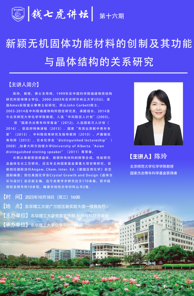 应党委宣传部邀请,北京师范大学化学学院教授,国家杰出青年科学基金获得者陈玲来到“爱体育官方网站”,以“新颖无机固体功能材料的创制及其功能与晶体结构的关系研究”为主题开展讲座。欢迎全校师生届时前往聆听。