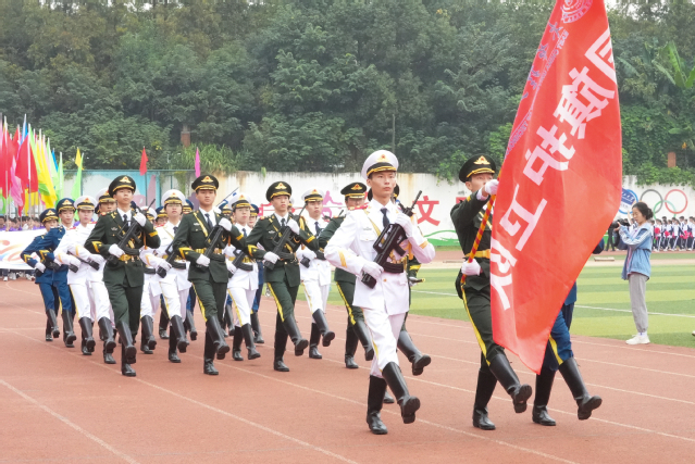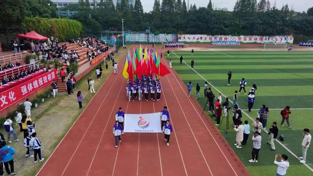 伴随着激昂的《运动员进行曲》,国旗护卫队迈着铿锵有力的步伐,护卫着鲜艳的五星红旗,走在队伍的最前列,尽显飒爽英姿。彩旗方队与裁判员方队紧随其后,意气风发,气宇轩昂,飘扬的彩旗,红的如火,蓝的如海,五颜六色,让整个运动场气氛热烈非凡。