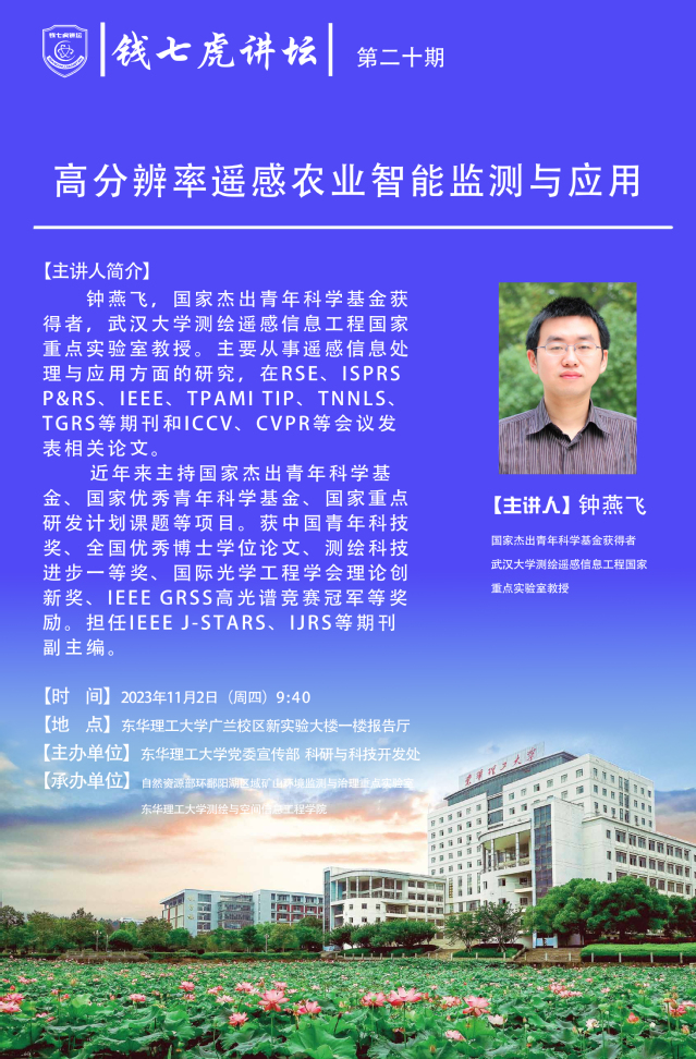 应党委宣传部邀请,国家杰出青年基金获得者钟燕飞教授来到“爱体育官方网站”,以“高分辨率遥感农业智能监测与应用”为主题开展讲座。欢迎全校师生届时前往聆听。