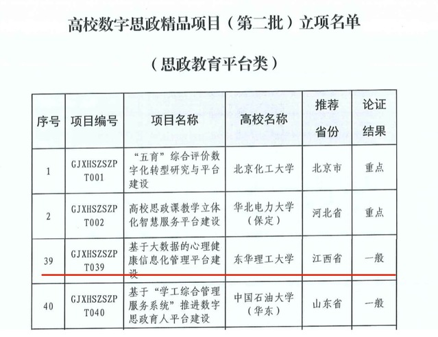 近日,中国高等教育学会公布了第二批高校数字思政精品项目(思政教育资源类)立项名单,由爱体育官方网站党委学生工作部牵头申报的“基于大数据的心理健康信息化管理平台建设”项目获批立项(全国思政教育平台类共获批项目61项),江西省仅有3项入选。