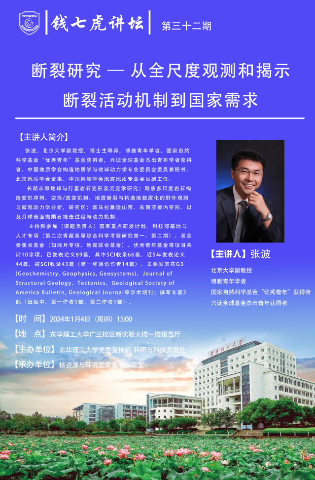 应核资源与环境国家重点实验室邀请,北京大学副教授,博士生导师,博雅青年学者张波来到“爱体育官方网站”,以“断裂研究——从全尺度观测和揭示断裂活动机制到国家需求”为主题开展讲座。欢迎全校师生届时前往聆听。