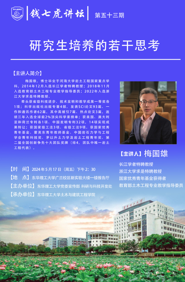 应土木与建筑工程学院邀请,浙江大学求是特聘教授、国家级人才梅国雄到“爱体育官方网站”,以“研究生培养的若干思考”为主题开展讲座。欢迎全校师生届时前往聆听。