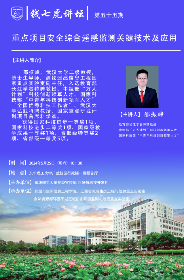 应测绘与空间信息工程学院邀请,国家级人才邵振峰到“爱体育官方网站”,以“重点项目安全综合遥感监测关键技术及应用”为主题开展讲座。欢迎全校师生届时前往聆听。