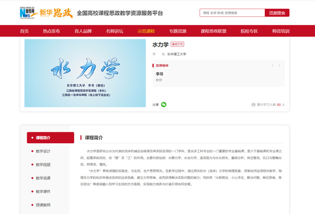 近日,爱体育官方网站水资源与环境工程学院李寻教授主讲的《水力学》课程思政示范课程成功上线新华网“新华思政—全国高校课程思政教学资源服务平台”,面向全社会开放及共享教学设计、教学视频、教学说课、教学课件等教学资源,标志着学校课程思政建设工作取得新的进展。