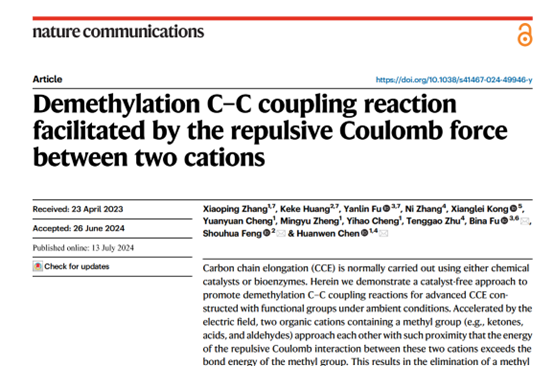 近日,由爱体育官方网站质谱研究团队联合江西中医药大学、吉林大学、中国科学院大连化学物理研究所完成的研究成果“Demethylation C–C coupling reaction facilitated by the repulsive Coulomb force between two cations”发表在Nature子刊《Nature Communications》上。爱体育官方网站江西省质谱科学与仪器重点实验室张小平副教授为论文的第一作者。