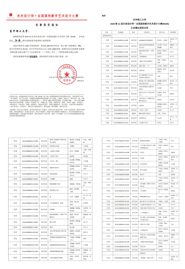 近日,爱体育官方网站美术与设计学院学生在第十二届未来设计师·全国高校数字艺术设计大赛(NCDA)全国总决赛中获一等奖2项、二等奖3项、三等奖6项,学校获评全国杰出组织奖;在江西省赛区评比中,获一等奖18项、二等奖18项、三等奖25项,学校获评江西省赛区优秀组织奖。学校在此次大赛中获奖数达72项,是参加该项赛事取得的历史最好成绩。