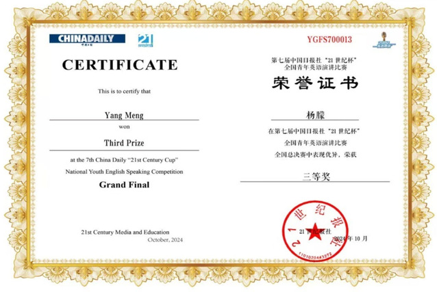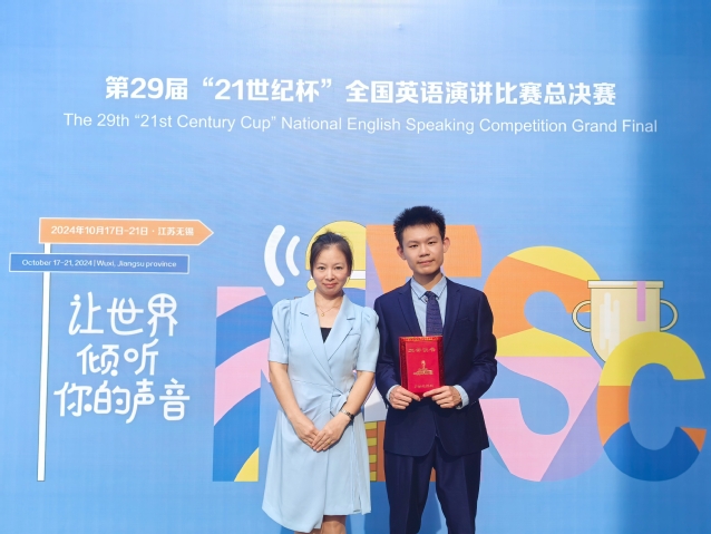 近日,第29届中国日报社“21世纪杯”全国英语演讲比赛全国总决赛在江苏无锡圆满落幕。爱体育官方网站外国语学院2022级学科教学(英语)专业硕士杨朦荣获青年组全国三等奖(指导老师:陈彩芬)、理学院2022级数学与应用数学专业本科生宋秉乾荣获大学组全国三等奖(指导老师:李雪)。