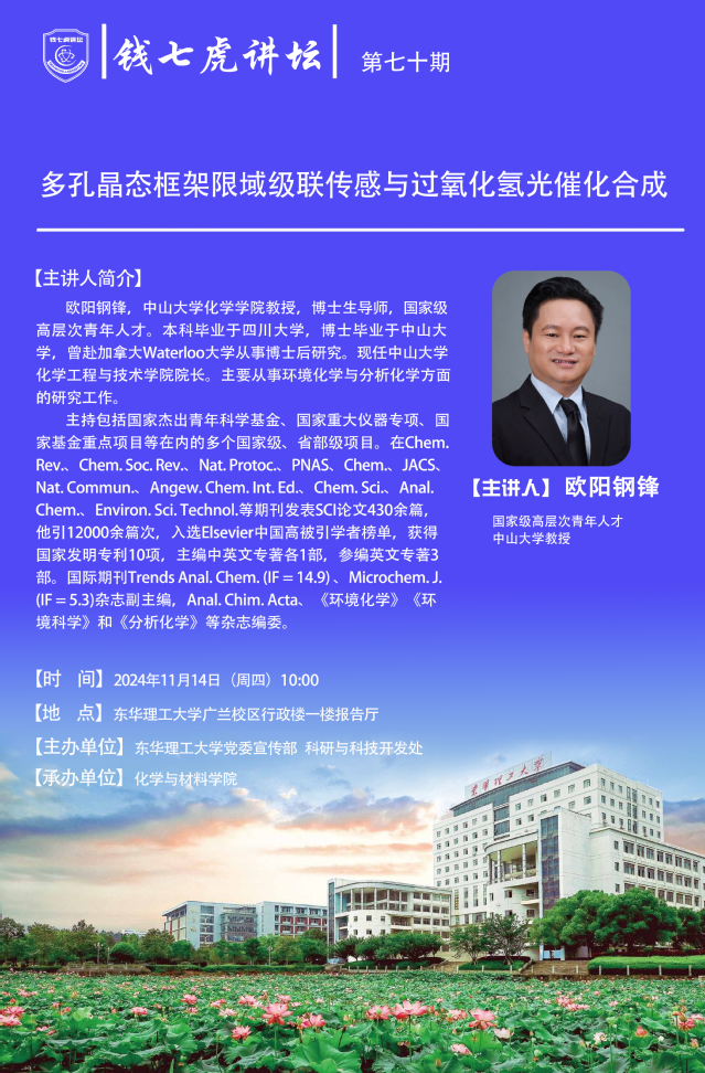 应化学与材料学院邀请,国家级高层次青年人才欧阳钢锋到“爱体育官方网站”,以“多孔晶态框架限域级联传感与过氧化氢光催化合成”为主题开展讲座。欢迎全校师生届时前往聆听。