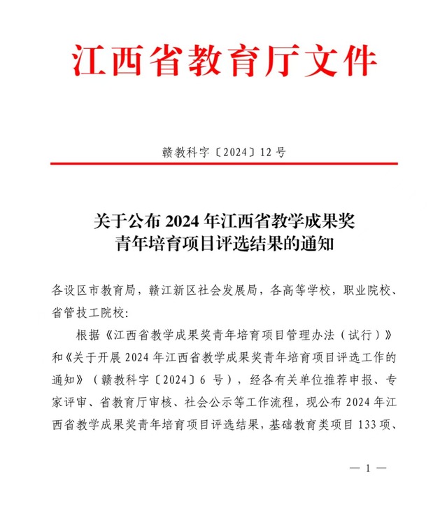 近日,江西省教育厅发布了《关于公布2024年江西省教学成果奖青年培育项目评选结果的通知》(赣教科字〔2024〕12号)。爱体育官方网站共有22个项目获批立项,其中本科教育类15项、研究生教育类7项,立项总数位列全省第三。