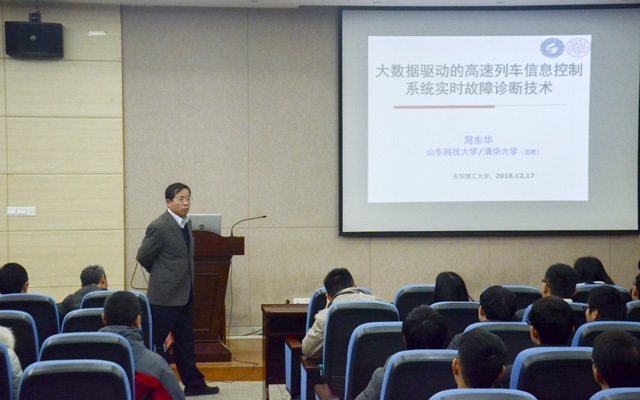 随后,周东华教授在地学楼C1报告厅为我校师生做了题为“高速列车信息控制系统实时故障诊断技术”的学术报告。作为动态系统的故障诊断与容错控制等研究领域的专家、国家自然科学基金重大项目《高速列车信息控制系统实时故障诊断与应用验证》负责人,周东华教授围绕项目的研究背景、科学问题、研究内容、预期成果等方面,与师生分享了该项目的研究进展情况。报告还介绍微小故障检测的递推变元统计分析方法、数据驱动的制动系统暂态过程故障检测方法等开创性方法,展示了间歇故障的实时诊断研究成果,并就相关学术问题与现场师生进行交流。